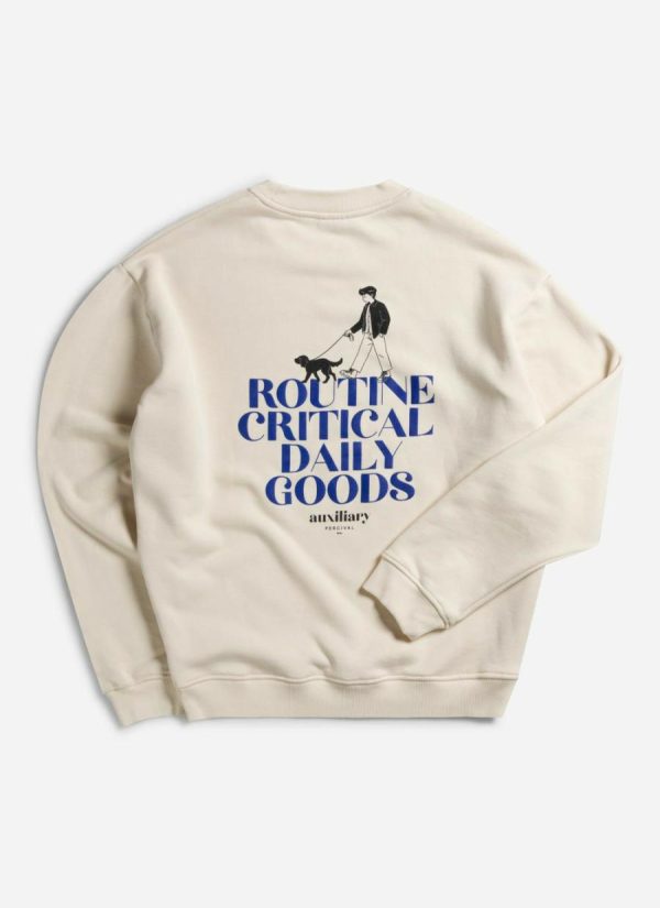 Percival Auxiliary part of the building blocks of every outfit of every day. Heavy weight crew neck sweat with dog walk print. What do I and many others do on the daily? Walk the dog. Not the yoyo trick. BCI 100% cotton heavy weight jersey goodness, made in Portugal hoody, embroidery at chest with puff print on back. Good for daily dog walking wear.