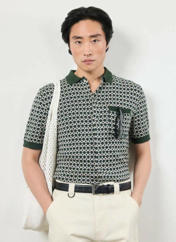 - Features: Men’s Knitted Shirt with Short Sleeves, Collar and Front Pocket in Jacquard Print
