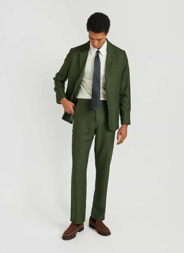 - Features: Men’s Houndstooth Tailored Trousers made from a custom dyed wool blend fabric. Finished with tonal corozo buttons, inside pockets and belt loops, these straight leg trousers are ideal for weddings and smart dressing.