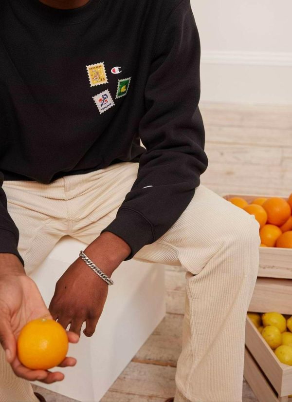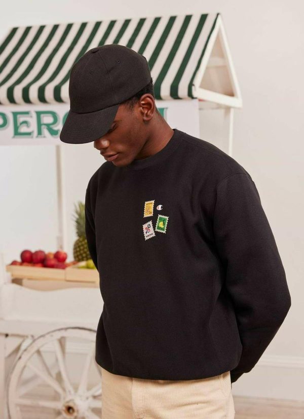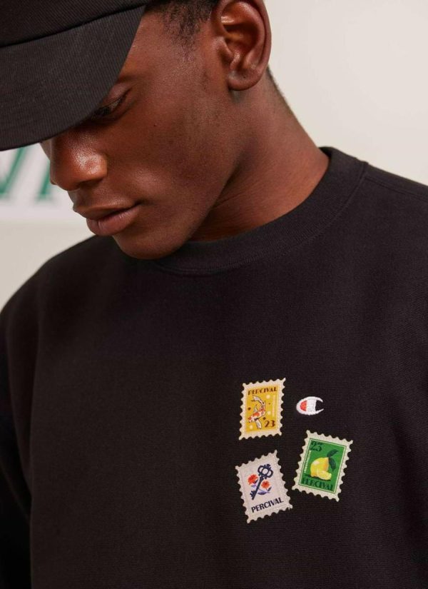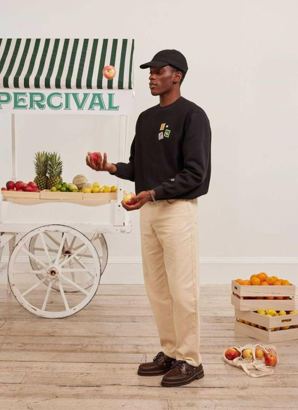 Champion and Percival – Celebrating some of the items you find at your local corner shop and the fine design detail that goes into the labelling of these items; the art of convenience. Limited edition Percival x Champion crew neck sweat, not quite a Penny Black. Hand drawn illustrations, woven into intricate labels. Applied onto heavy weight reverse weave Champion hoodies, sweats and quality tees.