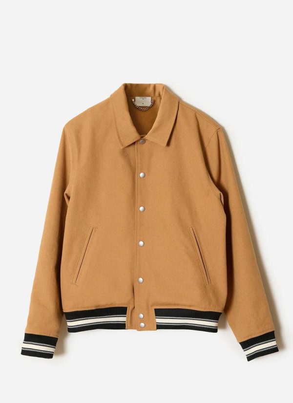 - Features: Men’s varsity bomber in tan, crafted from heavyweight cotton. Featuring silver snap fastenings, jetted welt pockets, and chunky rib detailing, this. bomber jacket from the Percival x Ilaria collection offers a relaxed yet stylish look with all-day comfort.